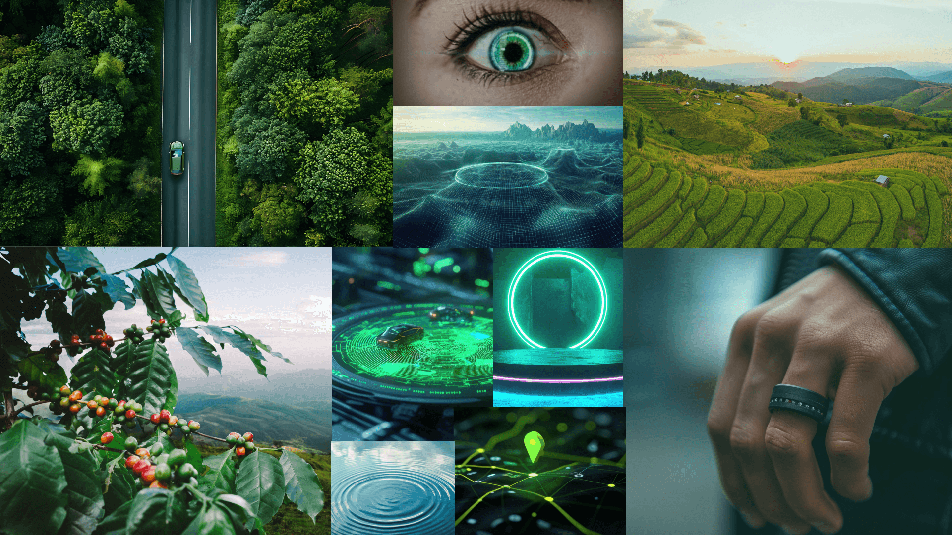 A curated selection of visual inspirations, textures, and color schemes reflecting the organic, sustainable, and high-tech ethos of the Raizes concept.