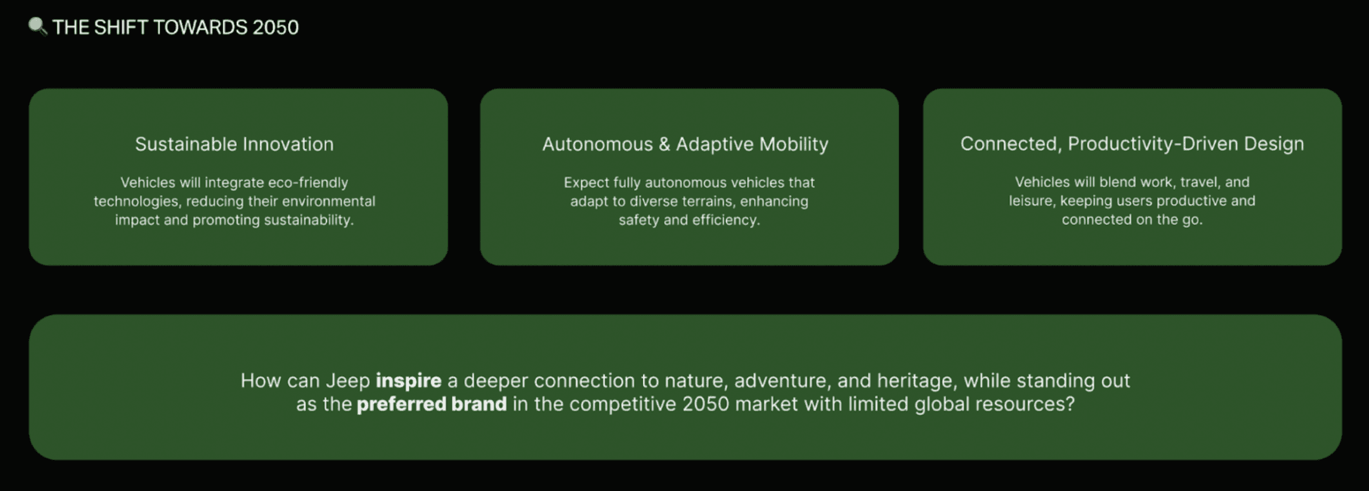 This project culminated in a presentation to Jeep our stakeholders, where we showcased our vision for the future of Jeep in agriculture and sustainable living. The feedback received was invaluable in refining our approach and ensuring the concept aligned with both business goals and user needs.