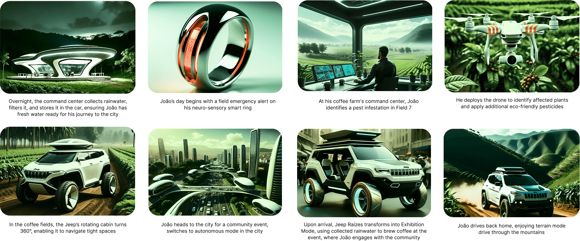A visual narrative (story-board) showcasing how users interact with the Jeep Raizes, from farm management to traveling across diverse terrains and enjoying the immersive features integrated into the vehicle.